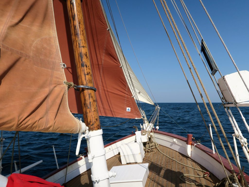 Le gréement serait celui d’un cotre à corne traditionnel. Un important bout-dehors, de près de 3 mètres, permettrait d’amurer le foc, déporté vers l’avant. Jacques-Yves Le Toumelin avait en effet des idées arrêtées sur l’équilibre du bateau sous voiles et sa capacité à naviguer barre amarrée. Bien qu’il n’ait commandé que les plans de la coque, Henri Dervin lui fournit également celui de la voilure.