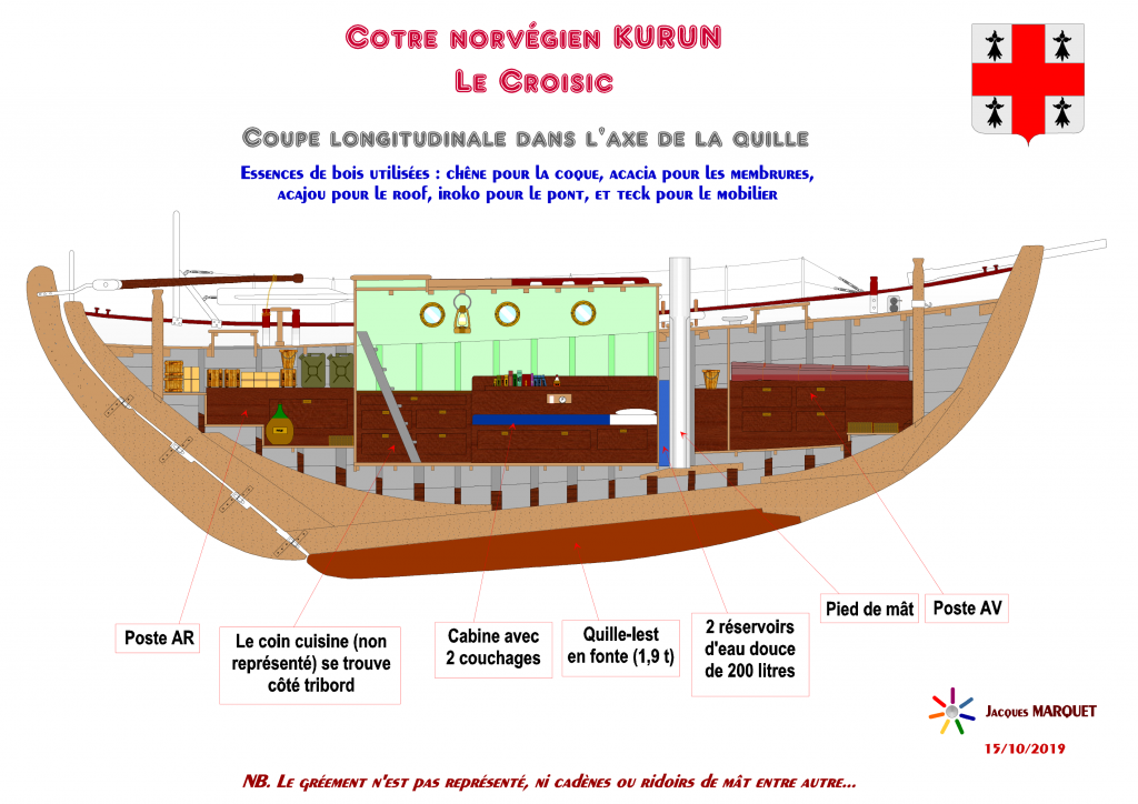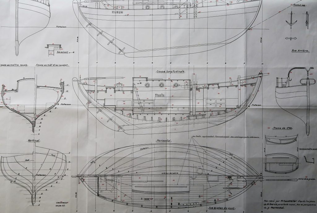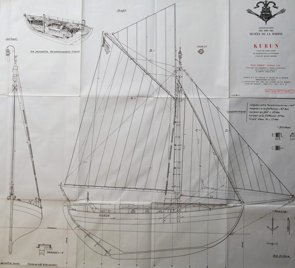 Il souhaitait en effet, comme il l’expliquera plus tard page 31 de Kurun autour du monde, un voilier doté de caractéristiques marines précises : « La coque est puissante, bien défendue, dotée d’une grande stabilité initiale avec une bonne réserve de flottabilité. Elle donne un bateau gitant peu, sec et au mouvement doux. La quille longue et le balancement des lignes sont des éléments de base pour une très bonne stabilité de route, ce qui est important. Le bateau est entièrement ponté et constitue un véritable caisson étanche quand toutes les ouvertures sont condamnées. Celle-ci se limitant au deux panneaux de descente de l’avant et de l’arrière, et à celui du rouf ».